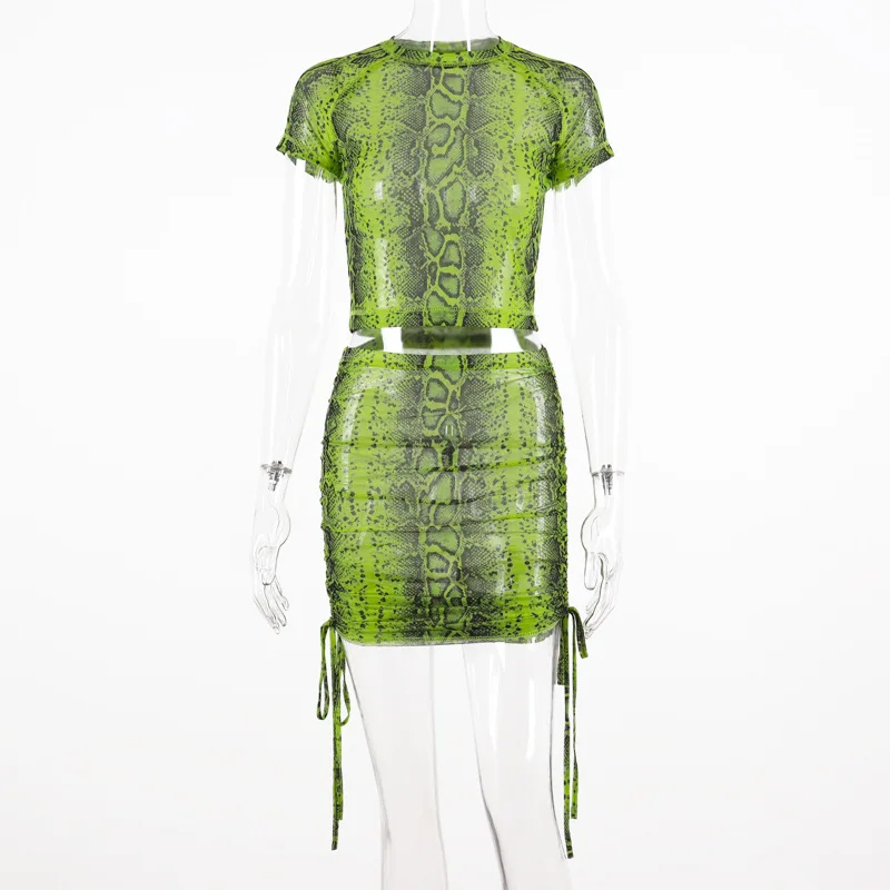 discount BOOFEENAA Serpentine Print Sexy Summer 2 Piece Set Women Sheer Mesh Neon Green Pink Two Piece Bodyc