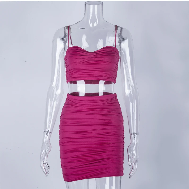 awesome NewAsia 2 Layers Ruched Two Piece Set Pink Outfits Set Crop Top And Mini Skirt Set 2019 Summer Part